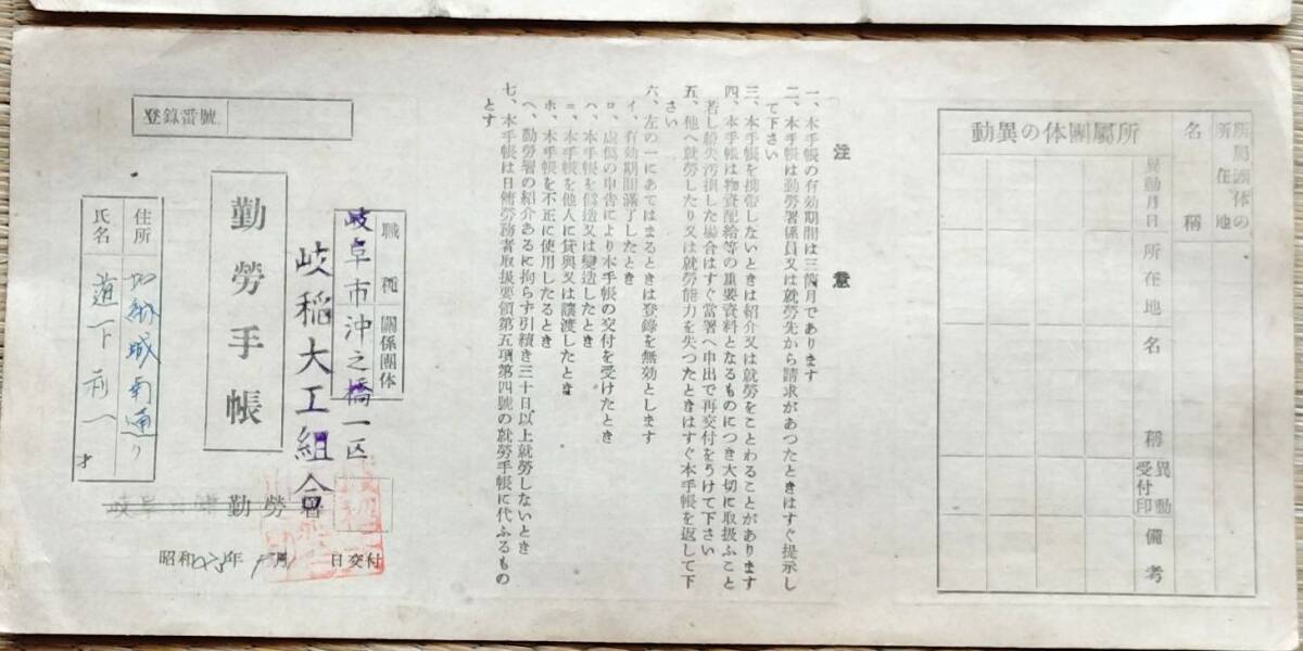 - f25010513〇大工組合勤労手帳 岐阜県 昭和23年〇和本古書