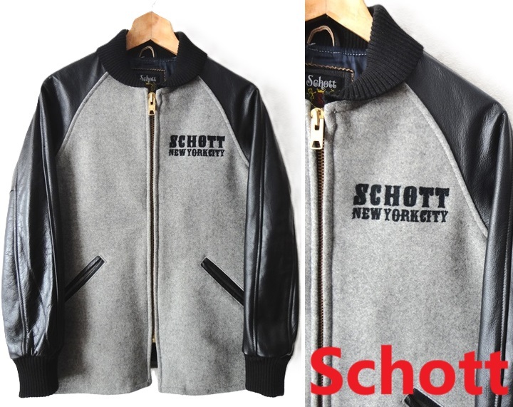 > 美品/Schott:ショット/上質 牛革/袖カウレザー×メルトンウール 刺繍入り ファラオジャケット/ファラオコート/グレー×ブラック/Ssize