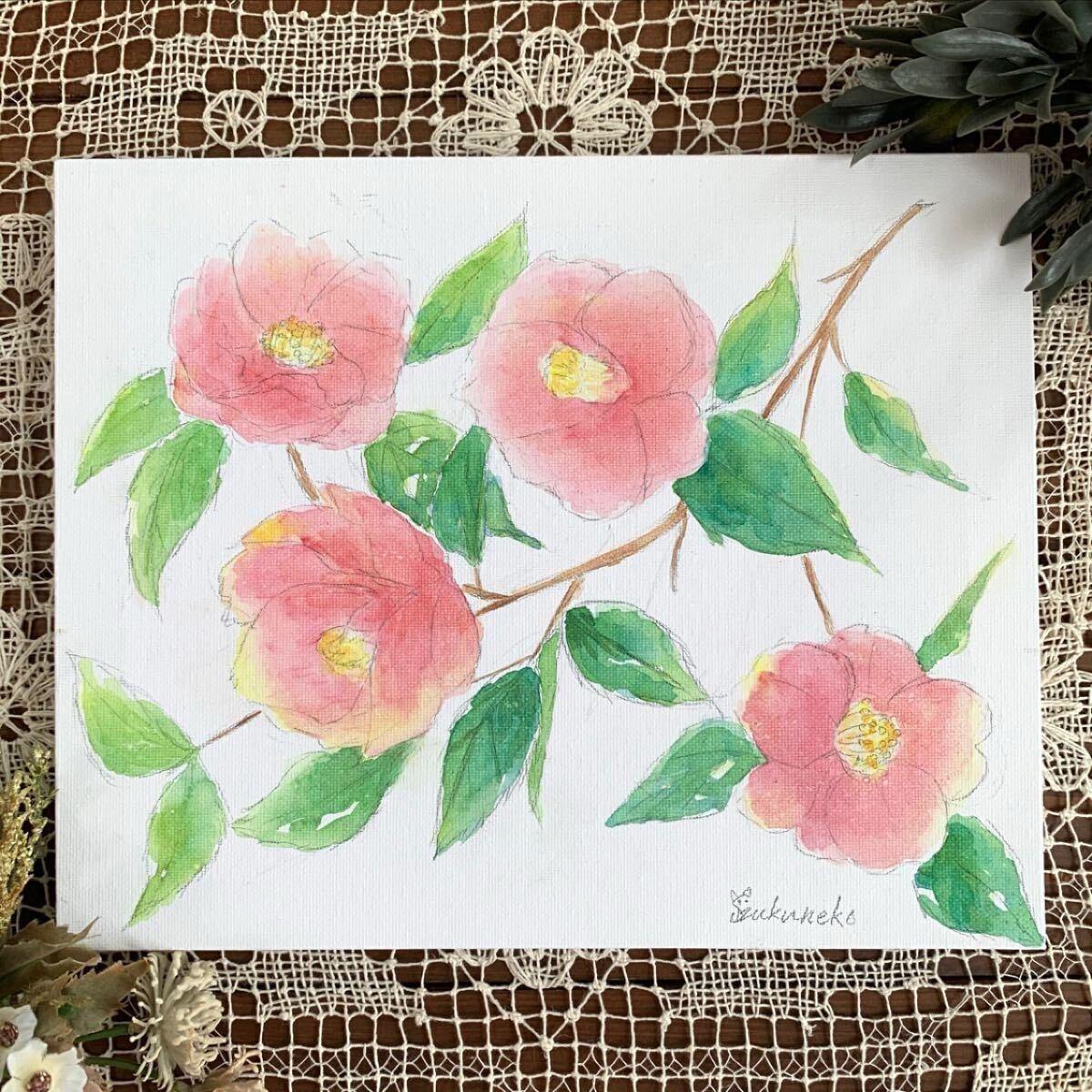 - 雫猫 nyago 水彩画 椿 冬の花 ボタニカルアート 植物画 イラスト 絵 絵画 手描きイラスト オリジナル キャンバス 原画 画家 直筆 真作 美術