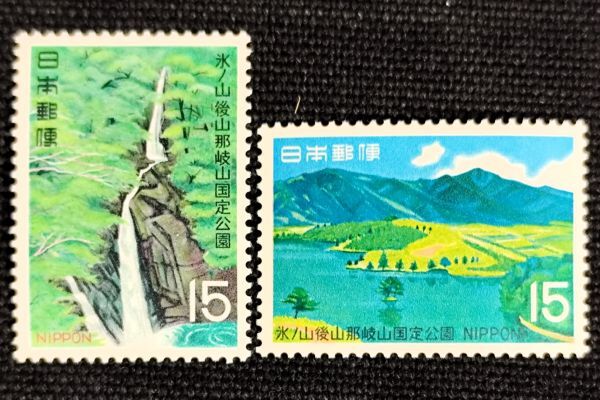 - [25011523]【国定公園 氷ノ山・後山・那岐山】単片2種「原不動滝・那岐山」15円×2 1969年発行 美品