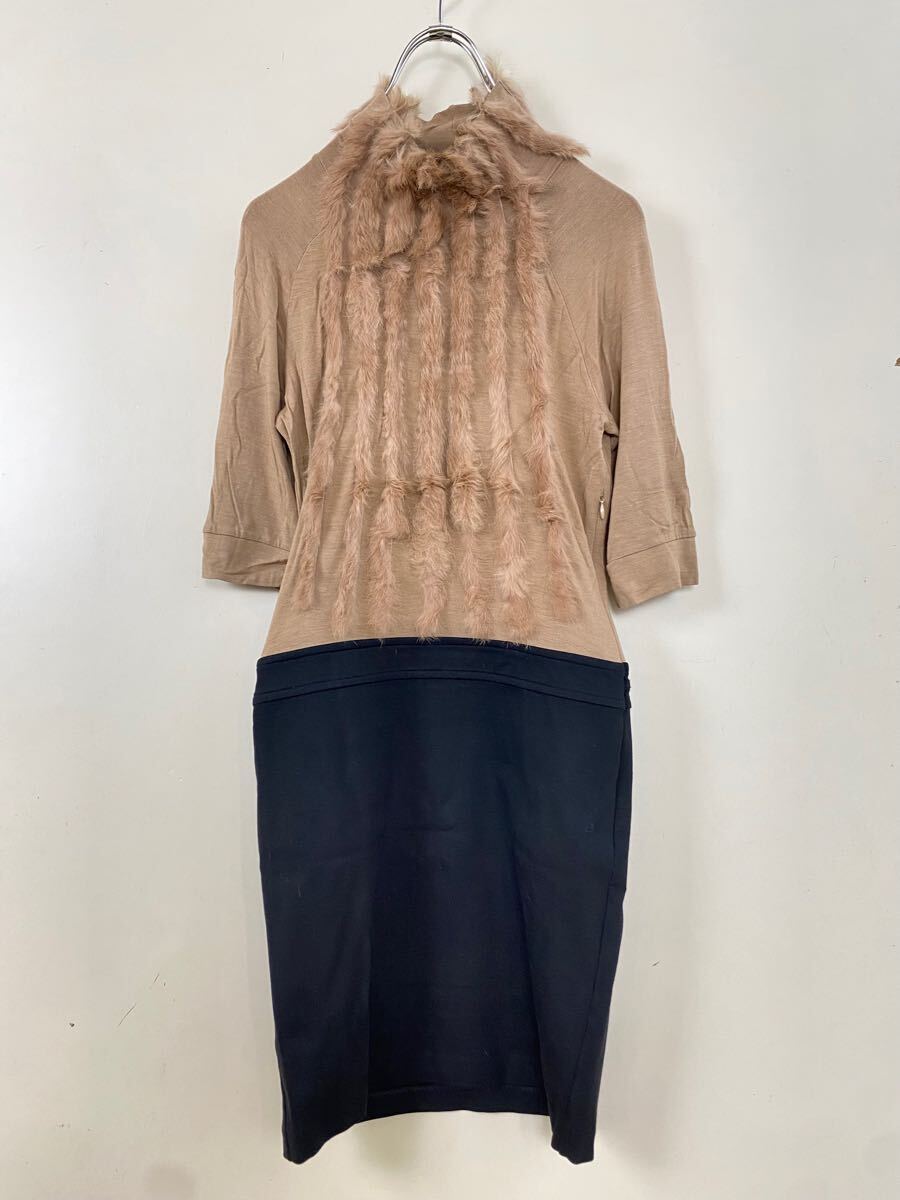 > ★ PAOLA FRANI ファー付き タイト ワンピース ベージュ/ブラック サイズ40 ◆ 半袖 ひざ丈スカート 伊製 パオラフラーニ ◆W18 HJN7あ-10
