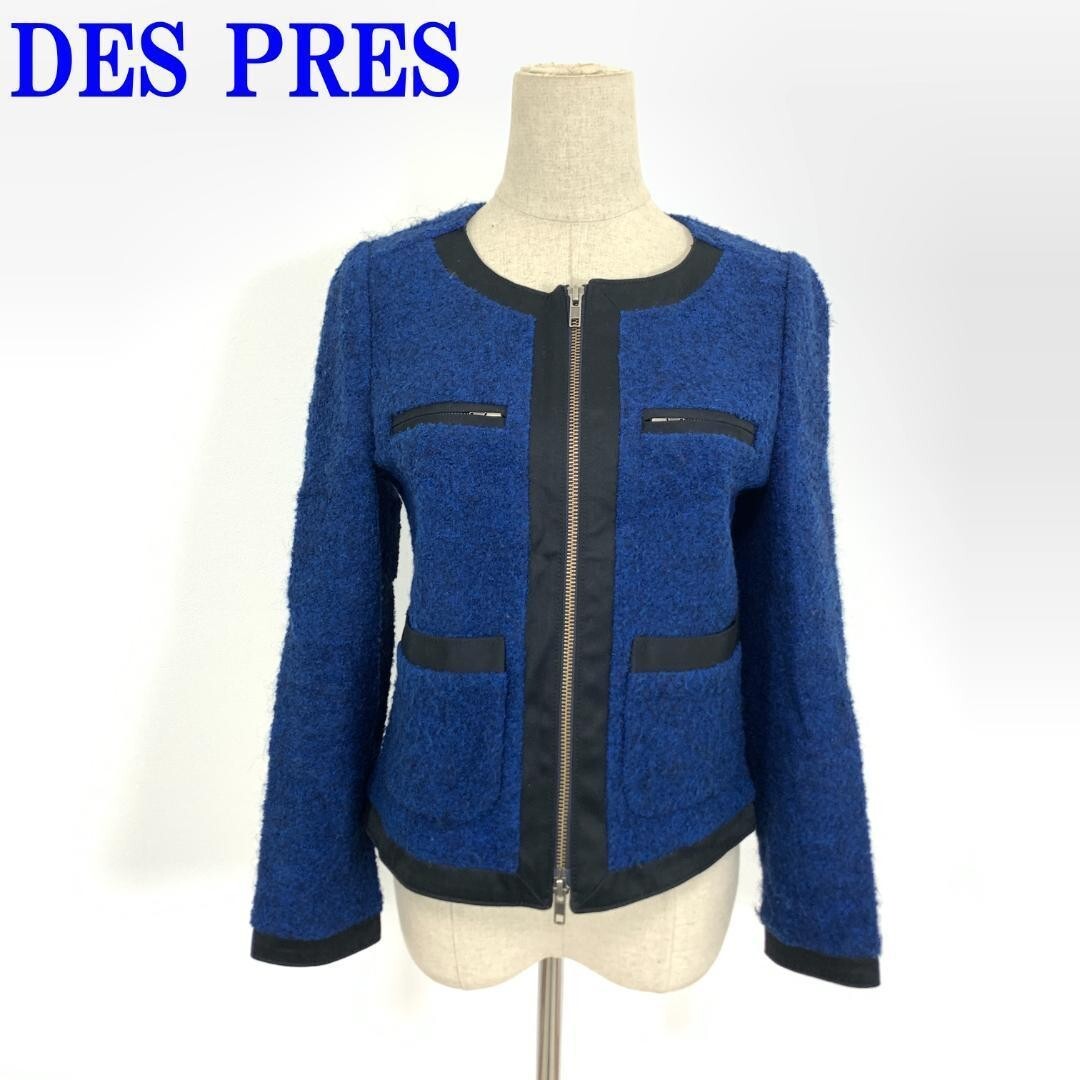 - デプレ ノーカラージャケット ウール 裏地有 青 紺DES PRES ブルー ネイビー ブラック 黒 S C1844