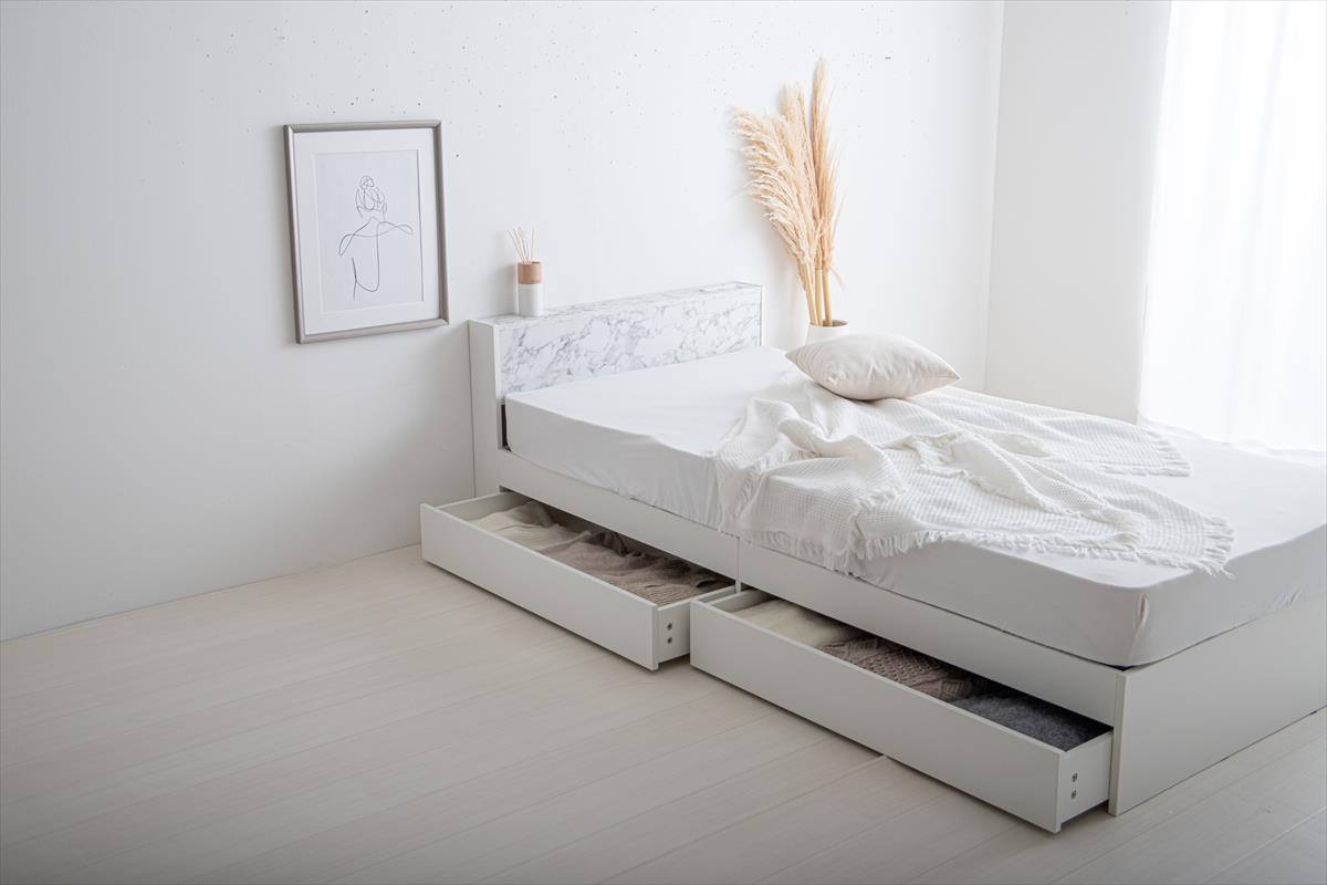 - 棚コンセントUSB付引出し収納ベッド シングル 大理石柄ホワイト フレームのみ
