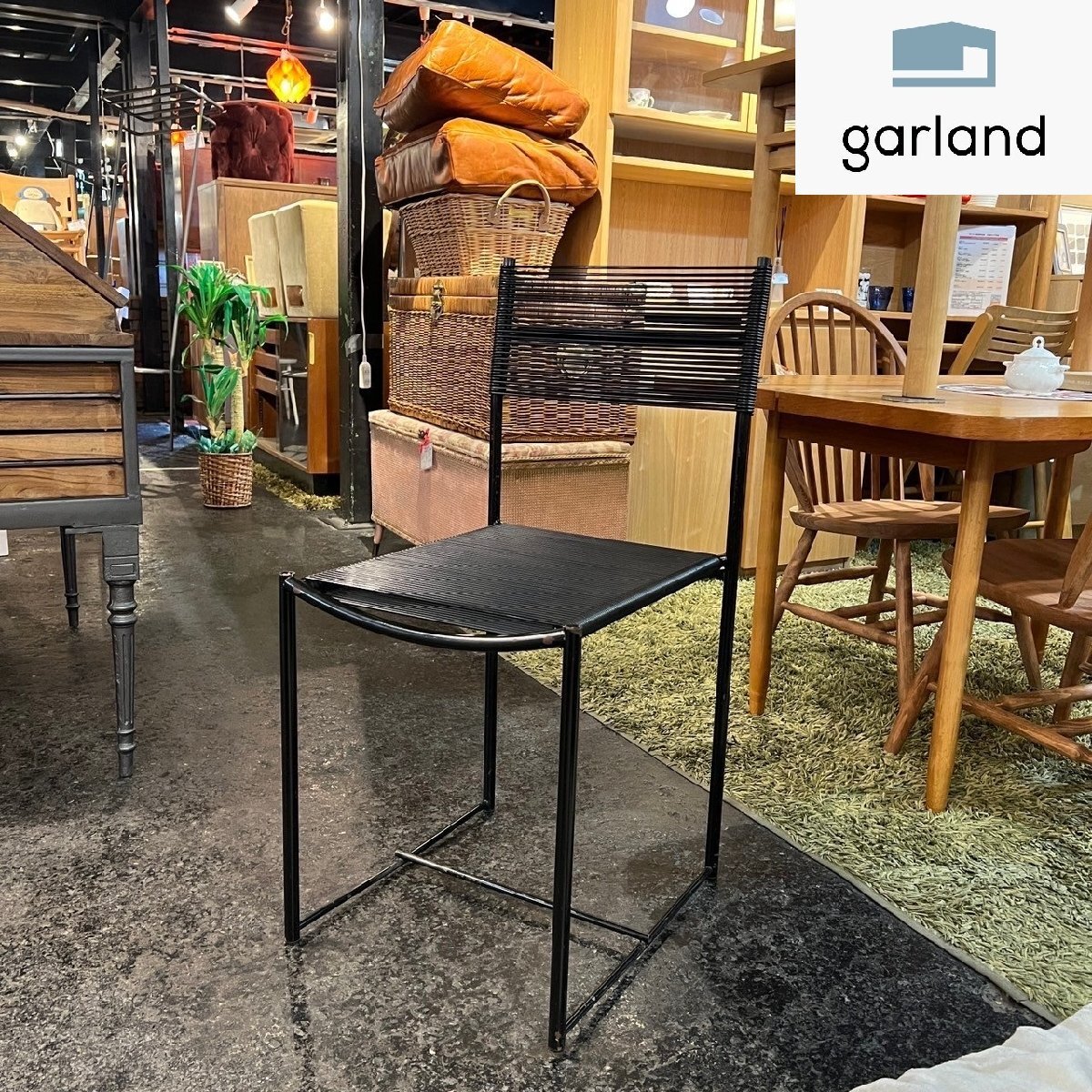 スチールフレームに食材のスパゲティのような半透明の塩化ビニールの細ヒモをまわして、座面、アーム、背面を形成した独特のチェアです。