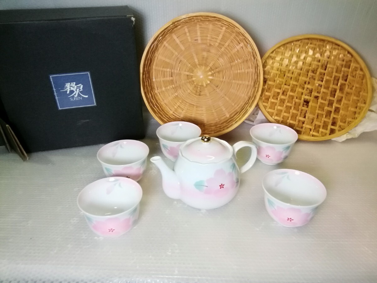 - 翆泉 SUISEN スイセン 茶器セット 花日記 籠入茶器揃 ピンク 竹籠/かご 急須 湯呑み/湯呑/湯飲み セット茶道具 煎茶道具 【未使用】