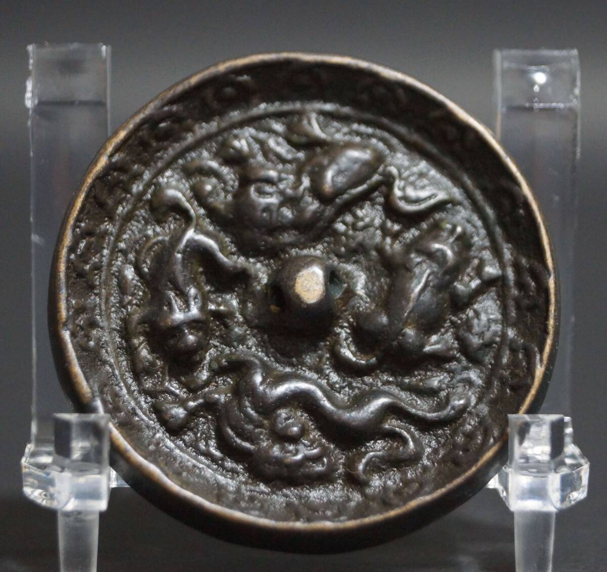 - 【閑】古銅鏡 金工細工 海獣文小銅鏡 根付 緒締玉 提げ物 装飾品☆径13.5cm★時代物☆7D0124