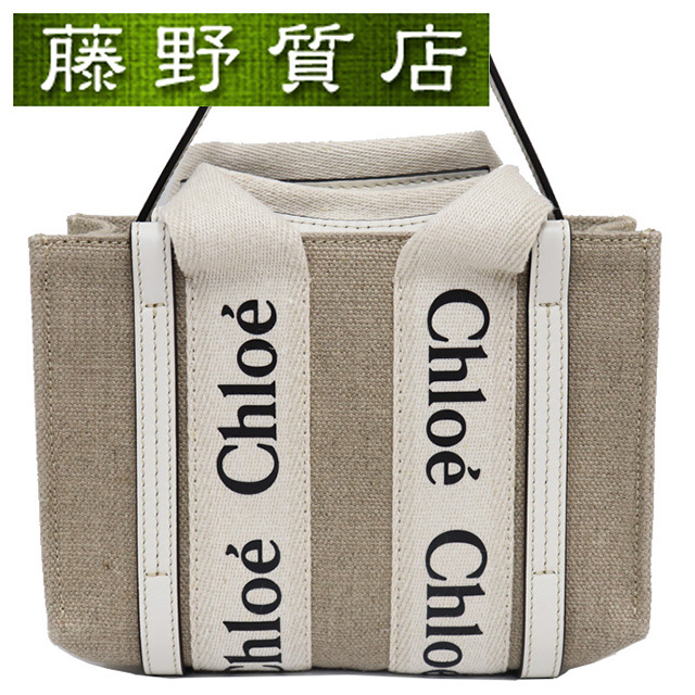 > (未使用展示品)クロエ CHLOE ウッディ ミニ トート バッグ レザー × キャンバス ベージュ × 白 CHC22AP237I26101 斜め掛け 8120