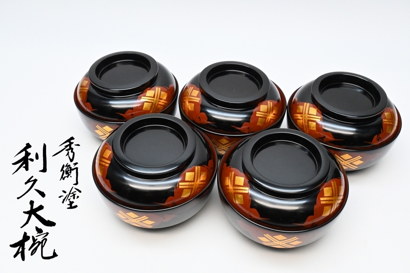 - 秀衡椀 丸三漆器 ■ 秀衡塗 [利休大椀] 5客 蒔絵椀 ■ 天然木 未使用 布 栞 木箱入 ■