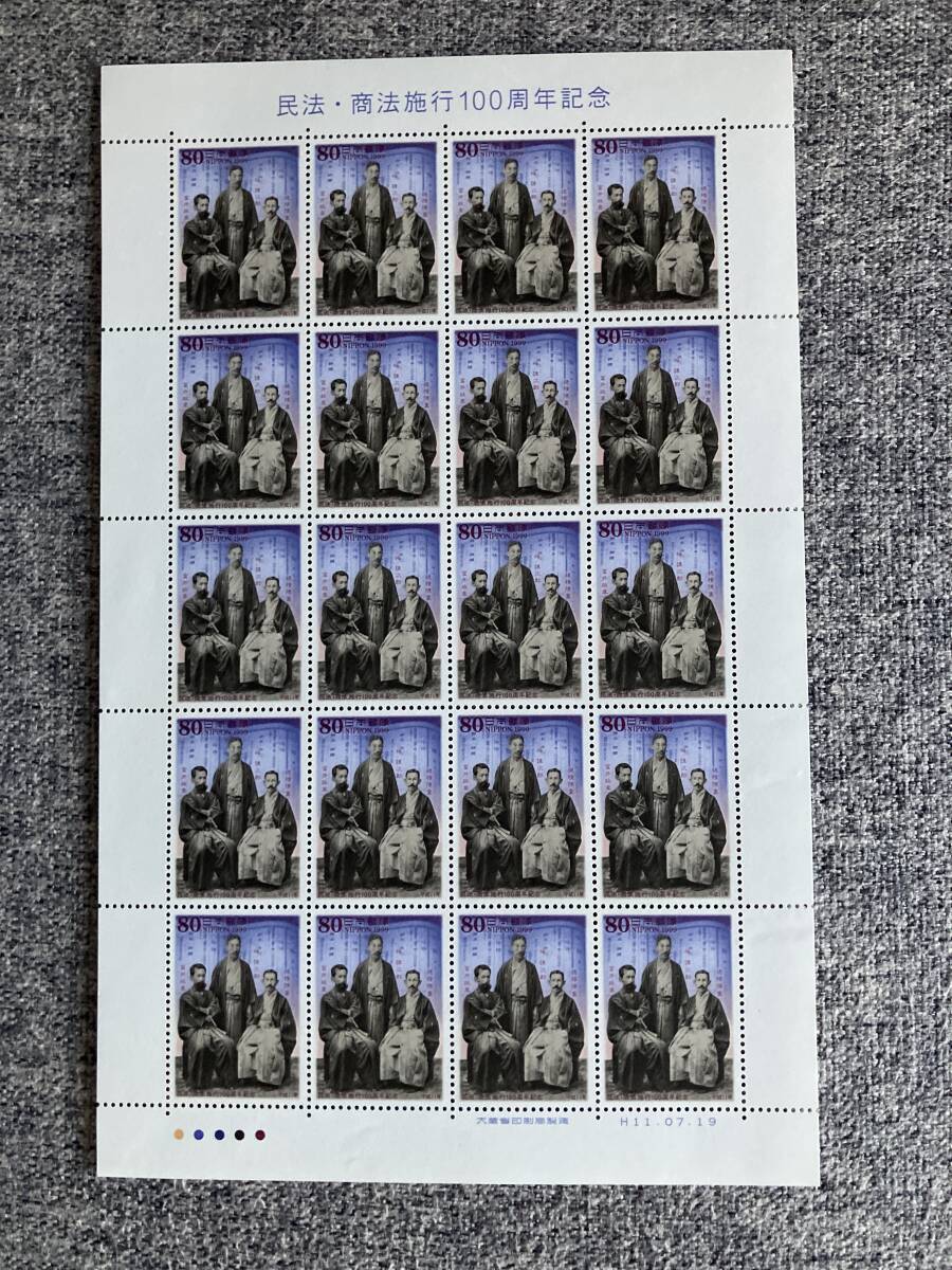 - ★未使用 民法 商法施行100周年記念 起草者の肖像 穂積陳重 富井政章 梅謙次郎 1999年 平成11年 切手シート 80円 20枚 日本郵便