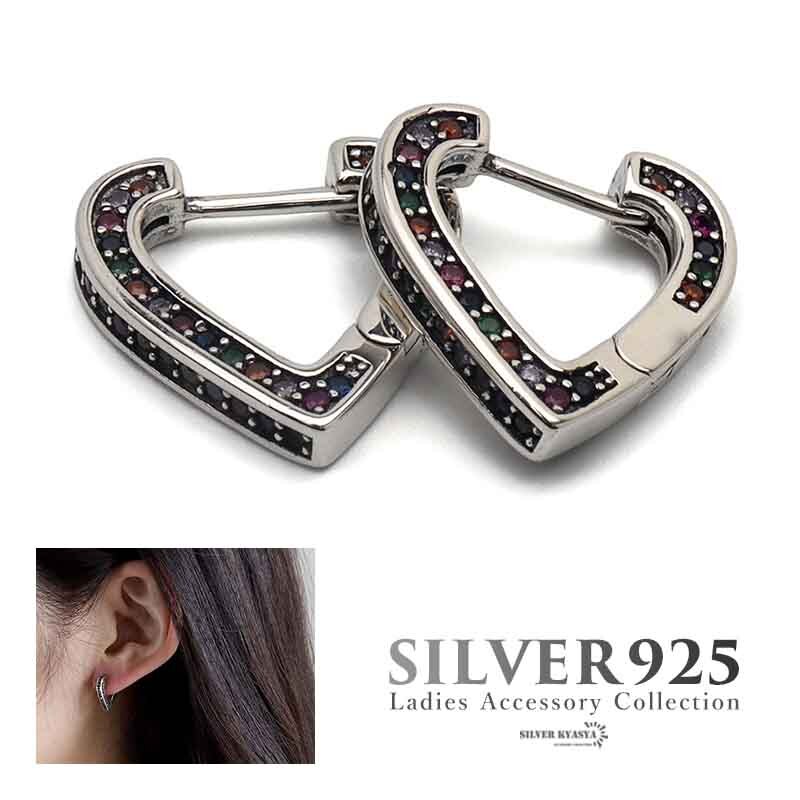 > ハートピアス カラフル フープピアス シルバー925 CZ レディース ハート 金属アレルギー対応 両耳用 2点セット