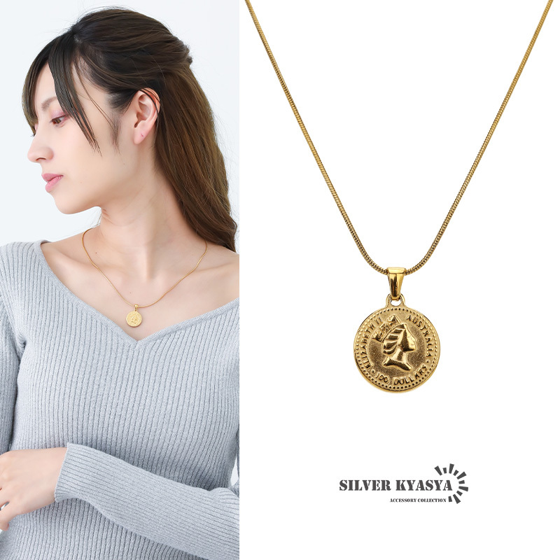> コインネックレス レディース スネークチェーン 細身 イギリス 女王 女性 ゴールド 18K GP ステンレス 金属アレルギー対応