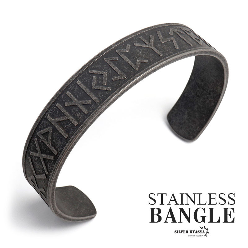 > ステンレス ブラック ケルト文様バングル ルーン文字バングル メンズ 平打ちバングル ブレスレット 腕輪 金属アレルギー対応