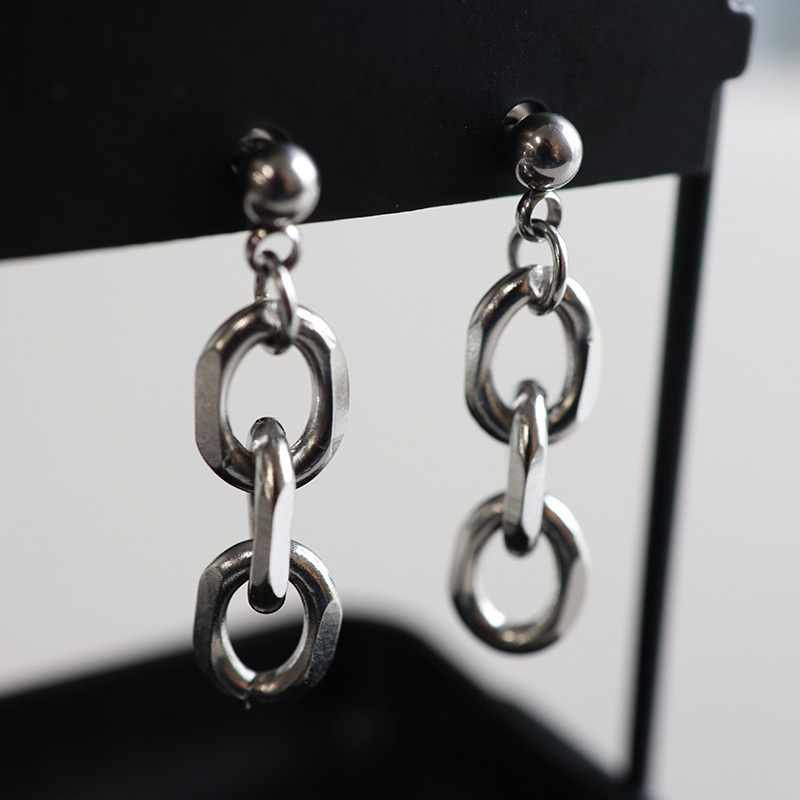 > ステンレス素材 ドロップピアス シルバー チェーンピアス オーバル 4面カット あずきチェーン 3連 金属アレルギーフリー 両耳