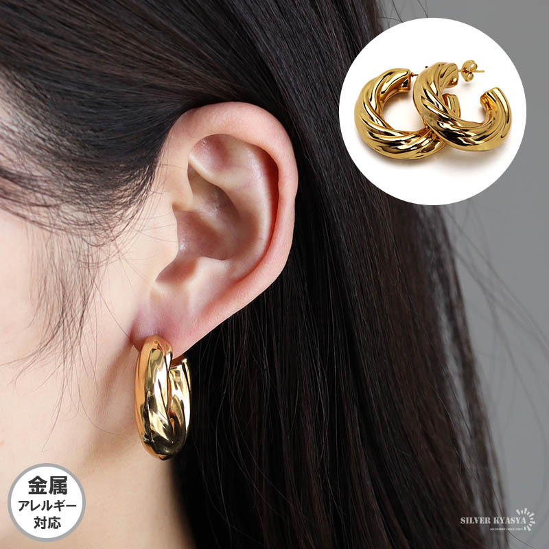 - 安心のステンレス素材 18KGP ワイドピアス ゴールド 金色 ツイストピアス 大ぶり 太め フープピアス 両耳 2点セット