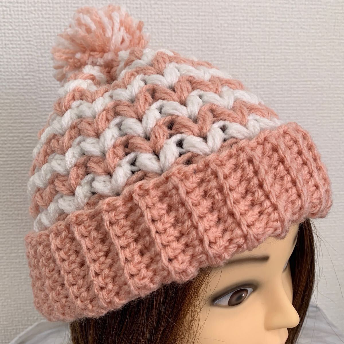 - 【a42】夢可愛い 桜 いちごミルク ぽんぽん付き ハート編み ニット 帽子