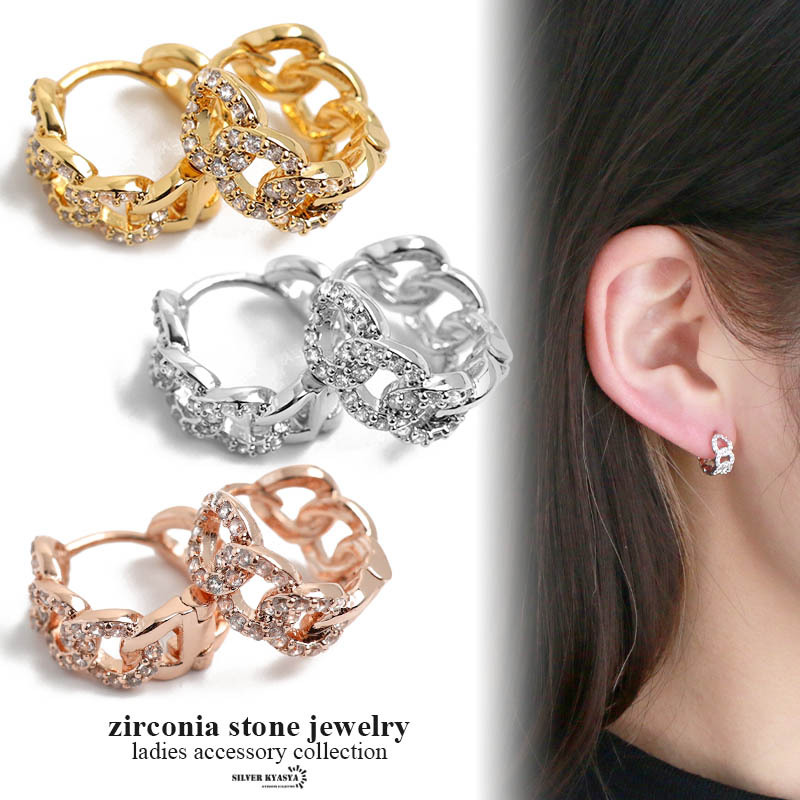 - (シルバー) 両耳用 フープピアス チェーン風 CZ パヴェ 爪留め ゴールド シルバー 喜平