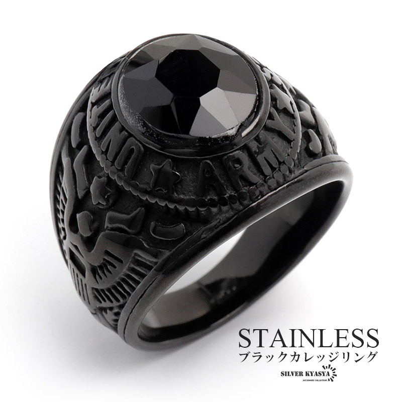- (19号) ステンレス素材 カレッジリング ブラック 大粒ジルコニア ブラック リング 指輪 一粒リング イーグル 黒