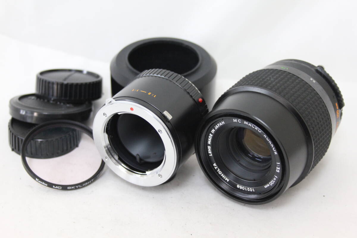 > 【返品保証】 ミノルタ Minolta MC Macro Rokkor 100mm F3.5 for MC Macro 100mm F3.5 前後キャップ フード付き レンズ M2743