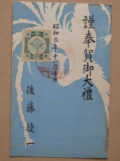 > 昭和3年 絵葉書 『 御大礼奉賀記念 』計1点 実逓便 大礼記念切手貼付 記念スタンプ 染織 阿波藍 郷土史研究家 後藤捷一氏作製 徳島市出身