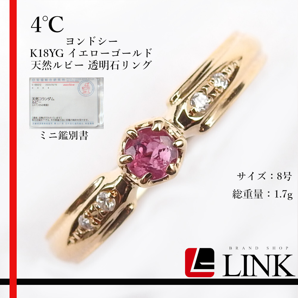 - 4℃ ヨンドシー K18YG イエローゴールド 天然ルビー 透明石リング レディース 8号 ミニ鑑別書