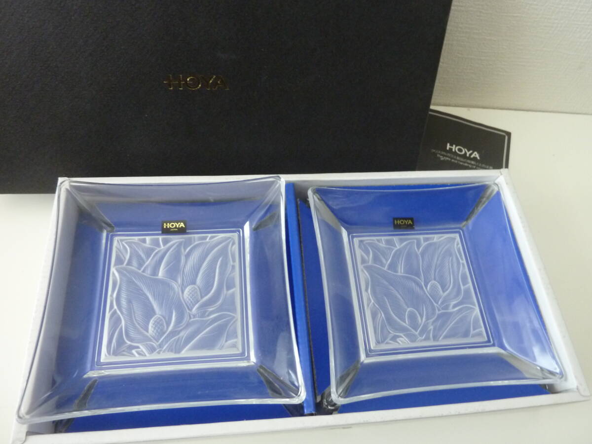 - 未使用 HOYA ホヤクリスタル 水芭蕉柄 角皿 5枚