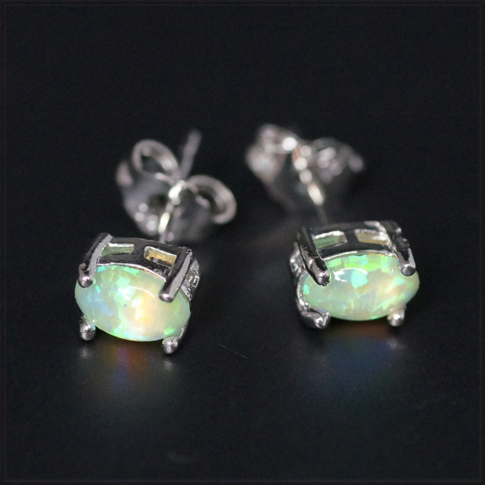 - [EARRING] White Gold Plated ハイクオリティ エレガント 6mmオーバル楕円 グリーン ファイアプレシャス オパール ストーン スタッドピアス