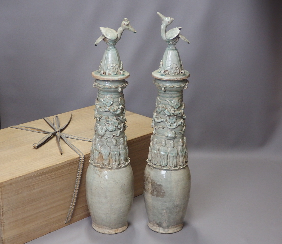 > 【骨董・中国】★宋時代★★特大日月壷 一対 gh011ul.7 貼花虎文花瓶 宋白磁 影青 中国古玩 花道 華道 神器