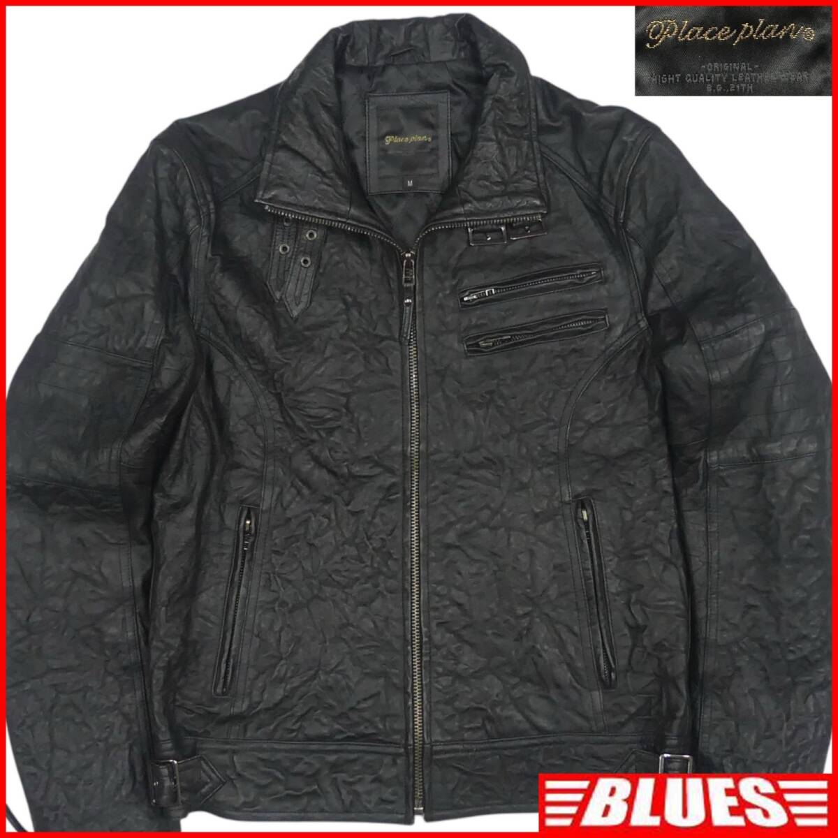 > 即決★Place Plan★メンズ M レザーライダースジャケット プレイスプラン 黒 本革 しわ加工 シングル 本皮 パンクロック ツーリング