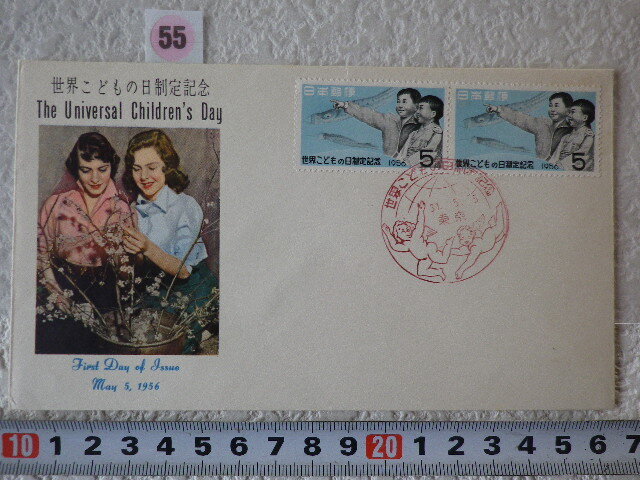 - FDC 世界こどもの日制定 1956年 2貼1消 説明書有 jpca●55●同梱大歓迎