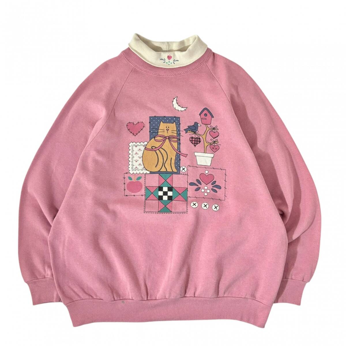 > 2XL~ 90s USA製 アメリカ製 古着 スウェット トレーナー ネコ 猫 動物 アニマル ハート 月 リンゴ パッチワーク ハイネック 付け襟 ピンク