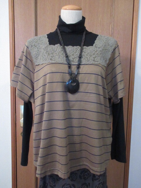> T)■ブランド品■【PISANO】■アボカド色/艶有り高級綿100%■肩回り楽なラグラン袖■幅広レース付きカットソー■