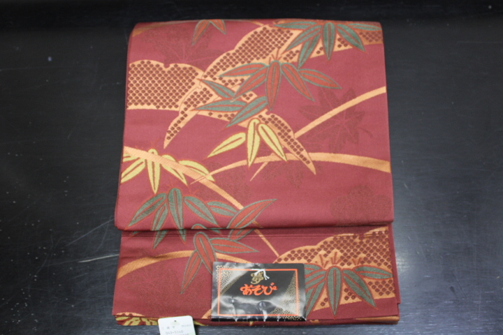 > きもの今昔8257 京袋帯西陣織 ポリエステル100% 濃い臙脂色鹿の子に笹の葉 影絵に紅葉と梅