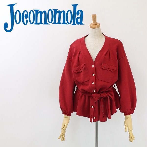- ◆Jocomomola ホコモモラ シビラ ボリュームスリーブ ウエストリブ リボンベルト付 コットン タック ニット カーディガン 赤 レッド 40