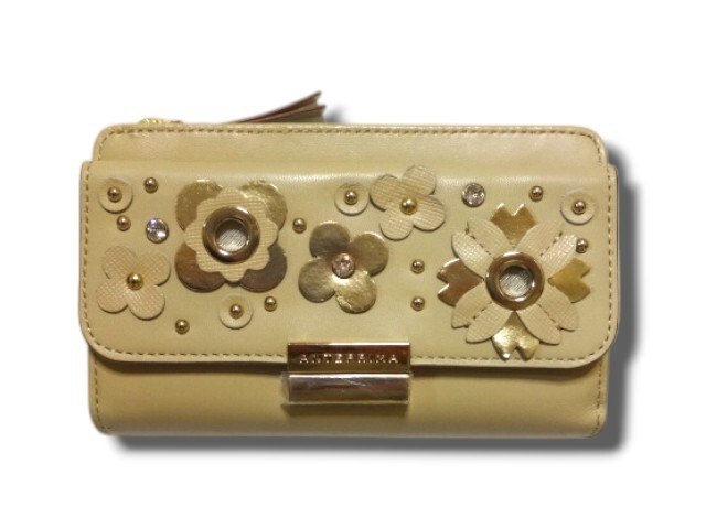 > 新品未使用 正規品 アンテプリマ ANTEPRIMA 二つ折り財布 クリームゴールド 牛革 花柄 ファスナー小銭入れ 訳あり