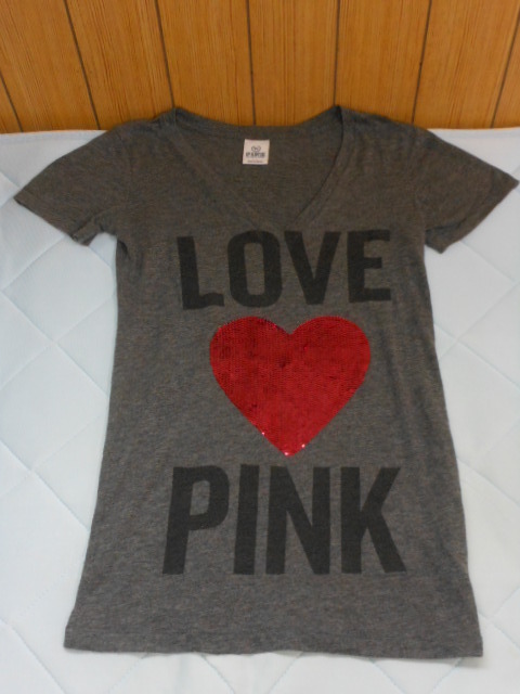 - 『送料無料です』◆ヴィクトリアシークレット PINK ブランド◆スパンコール派手に煌めくハートマーク LOVE Tシャツ 脇下すぐ身幅36着丈60