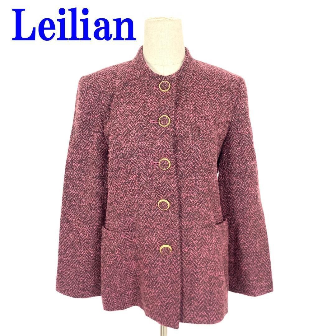 - Leilian レリアン ジャケット ウール 赤系 ノーカラーツイード調 ボルドー系 ピンク系 11 C2226