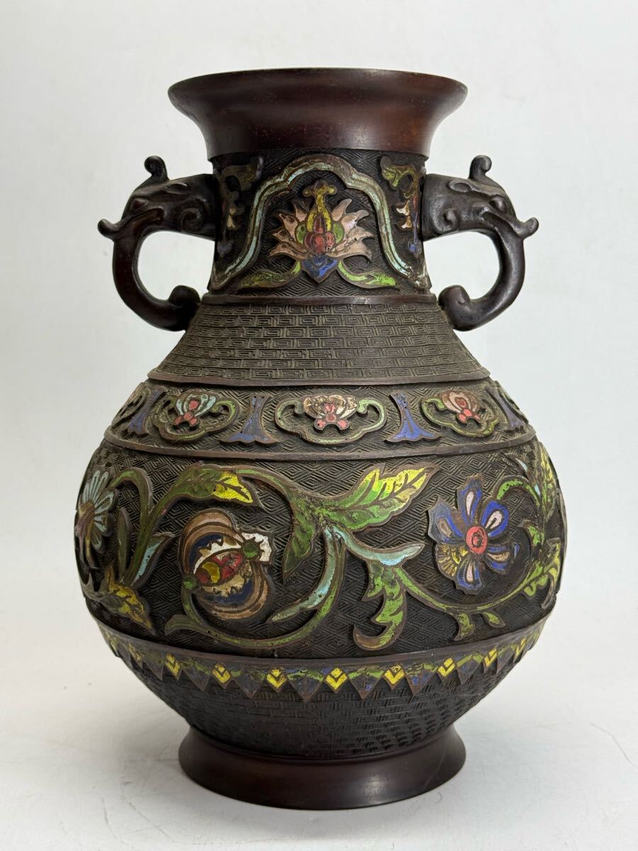 - 中国 古銅七宝双獣耳花入 花瓶 茶道具