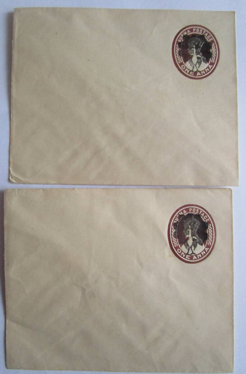 - 南方占領地・ビルマステーショナリージョージ6世1A封皮刷色違いに黒孔雀T3(止り木なし)加刷2通(JSCA評価額2万6千円)