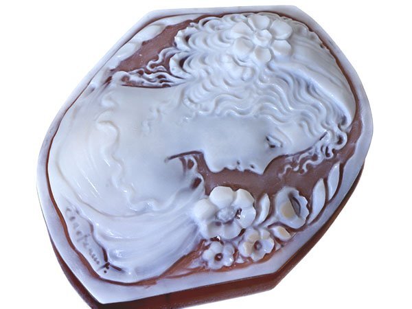 - 【ジュエリー極】作家品 サイン刻印有 お洒落な貴婦人と花の彫刻 高級シェルカメオルース 53.7mm×43.8mm w5052i【送料無料】