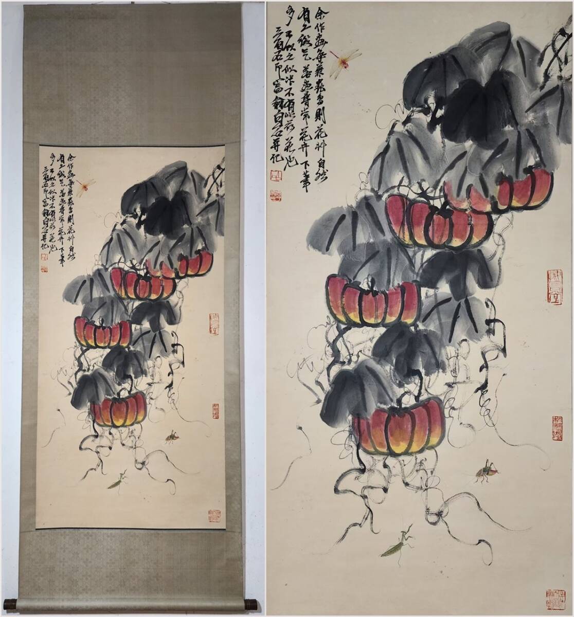 - 古美術 掛け軸 中国・近現代 「斉白石書」 紙本 【南瓜草虫図】 立軸 書道 巻き物 肉筆保証 唐物 古画 画心136.5x67.5cm LT-250306