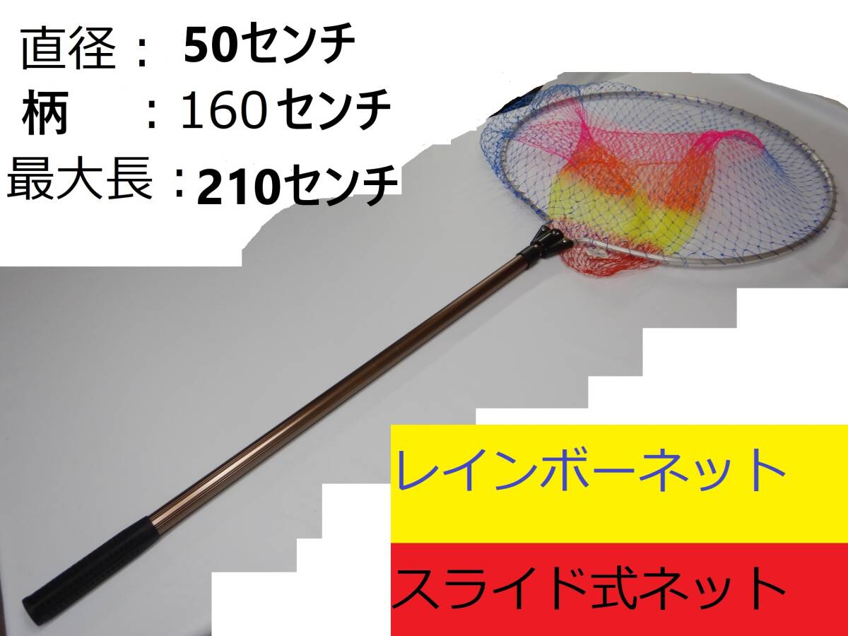 - 新品★レインボーネット◆直径:約50㎝◆柄の長さ:87㎝(最大:160㎝)★スライド式ネット◆網の目:1.5×2㎝ 最大210センチ