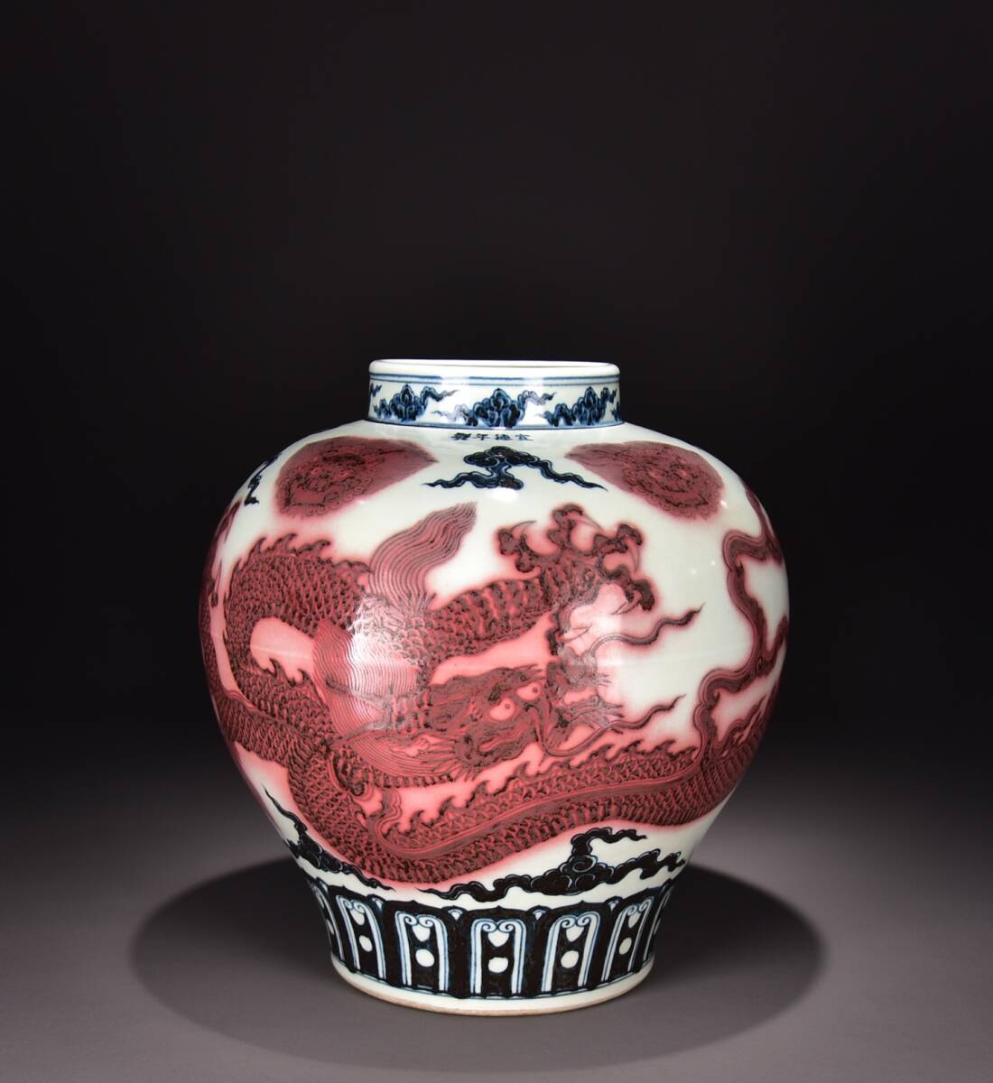 - ▽鴻▽ 明 宣德年製款 青花 釉里紅 龍紋罐 古陶瓷品 置物 古賞物 中国古玩 中国古美術