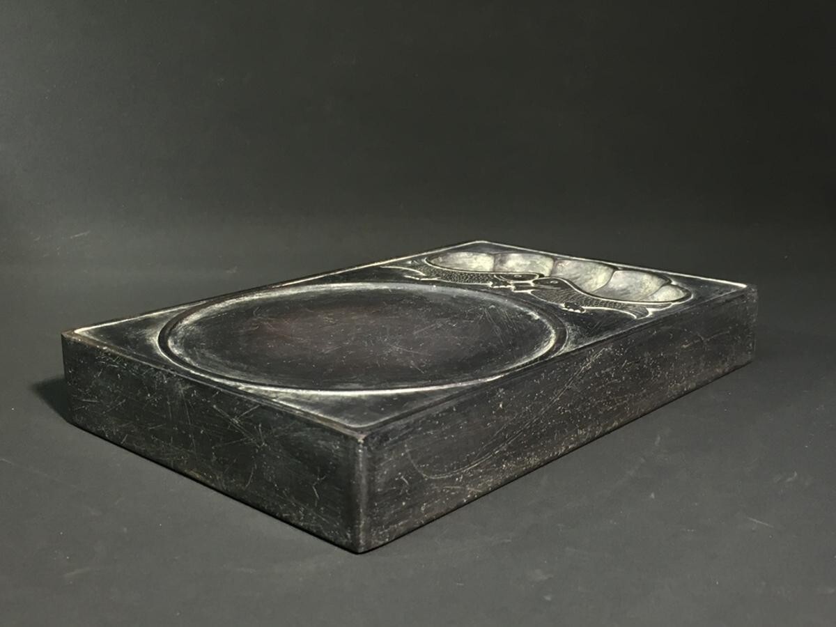 - 清代 端石浮彫 海棠池双魚文房端渓硯 李光地銘【仁】手彫り 文房具 書道具 中国古硯 蔵出 骨董