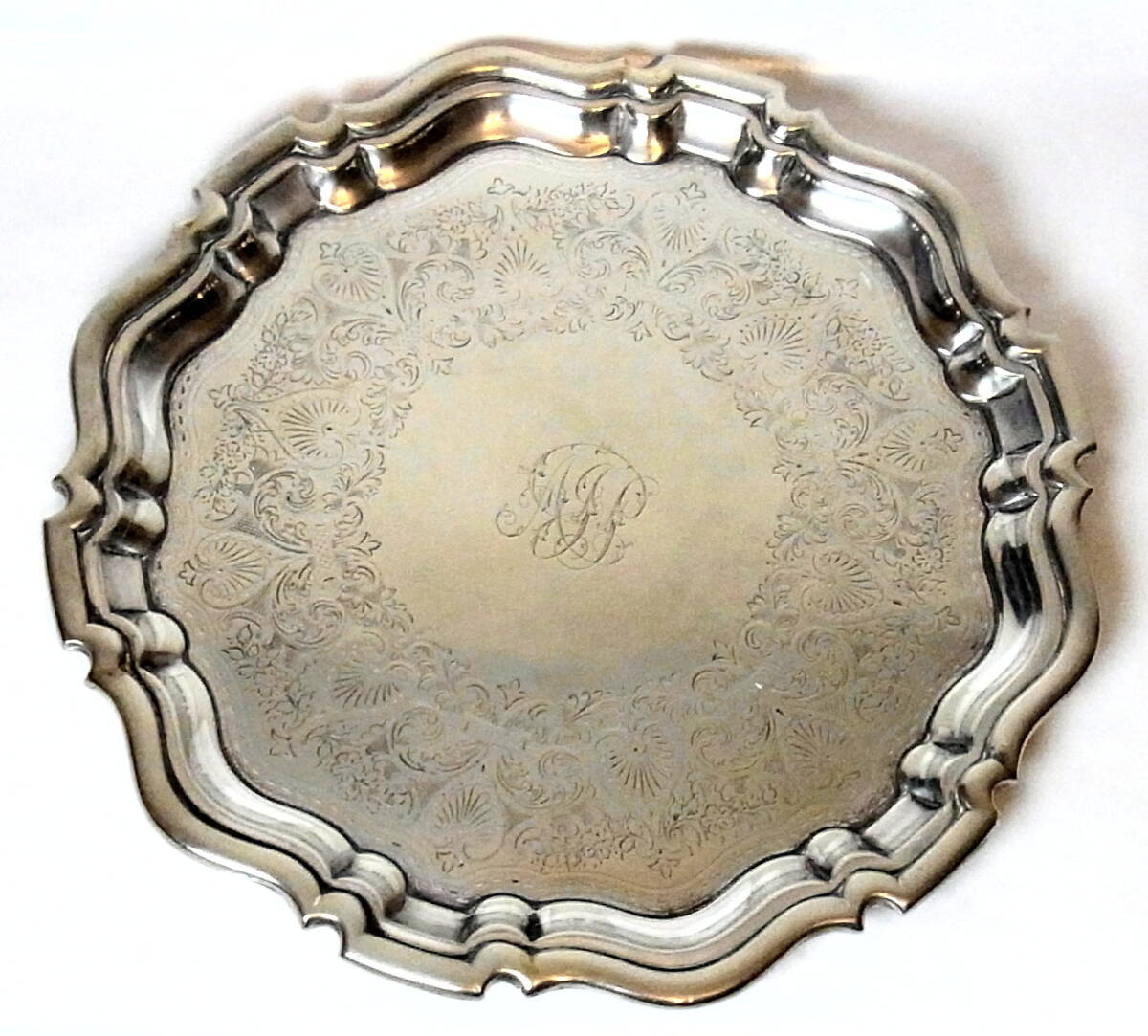 - 英国骨董 THOMAS LATHAM & ERNEST MORTON シルバープレート トレイ サルバ 30cm モノグラム入り 銀鍍金 アンティーク
