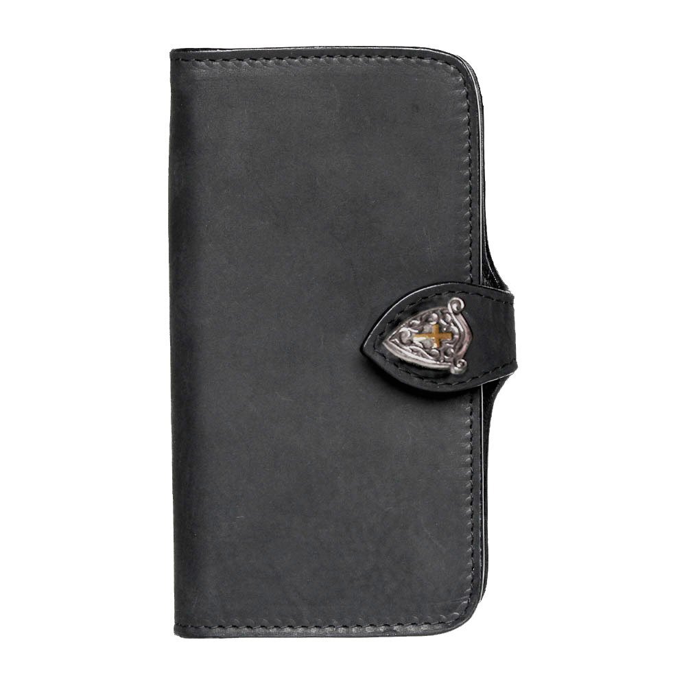 > iPhone 14Pro 手帳型スマホケース ブラック サッビア ステッチ アイフォンケース 姫路レザー 本革 コンチョ付き