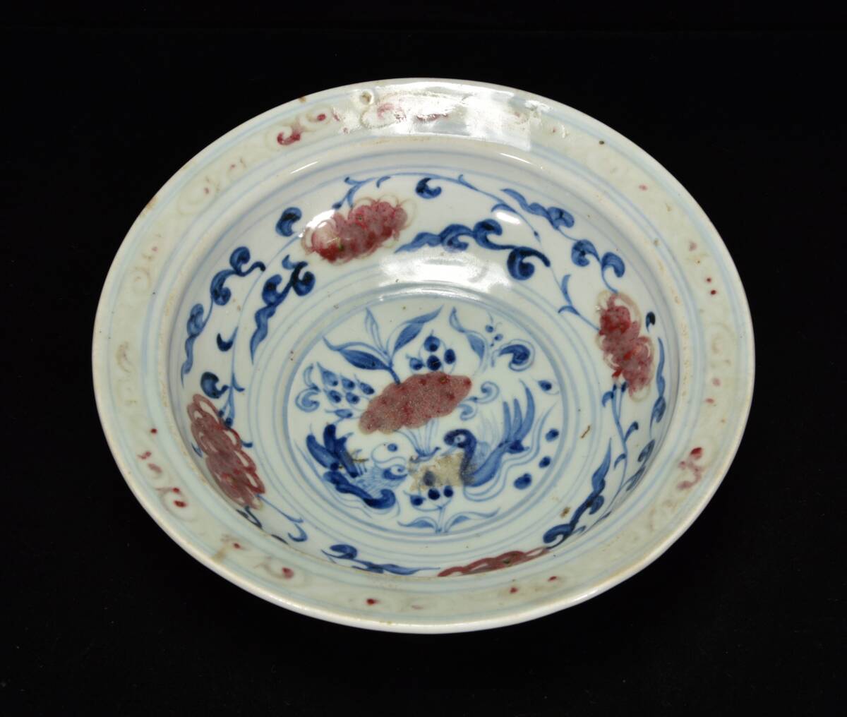 - 【仁】『元・古陶瓷品・青花・釉里紅・鴛鴦戲水紋・供盤』極細工 古賞物 中国古玩 古美術 古美味