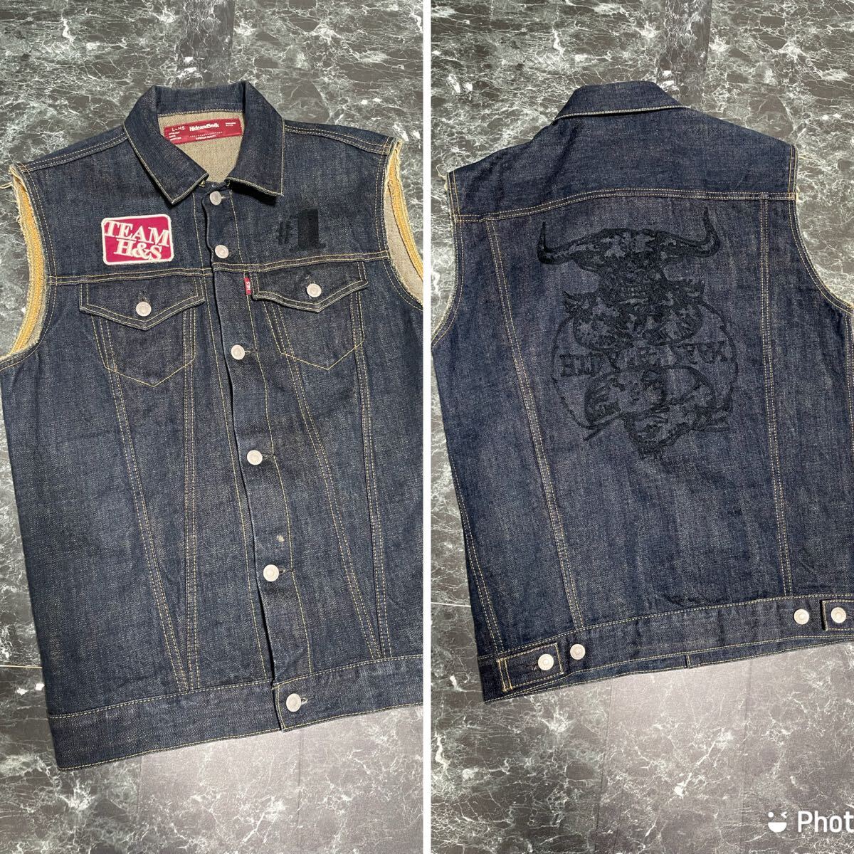 - HIDE AND SEEK ハイドアンドシーク デニムベスト ワッペン 刺繍 L