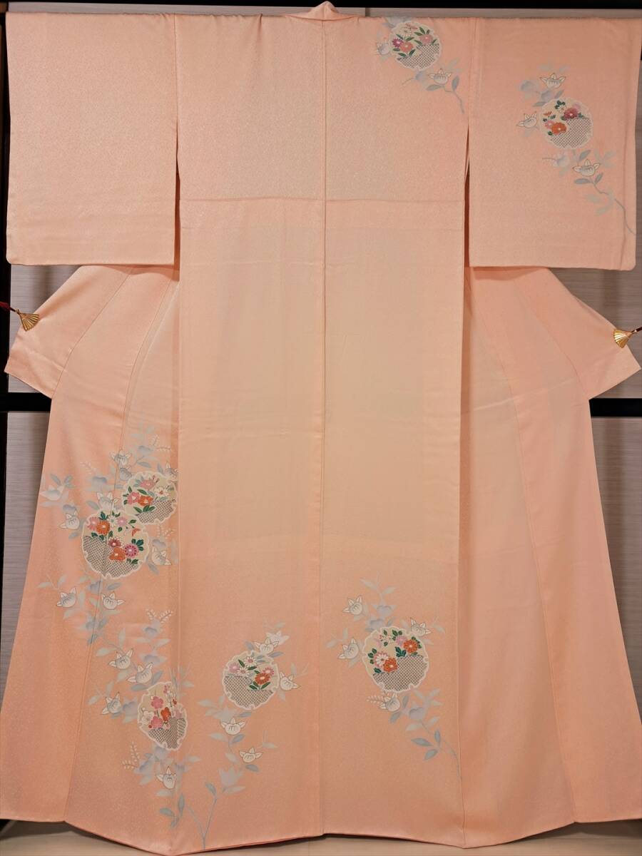 - 即決■着物の越田■裄66身丈165.5 正絹 付下げ 袷 広衿 雪輪 菊 椿 梅 橘 金彩加工 訳あり品 巣◇ひ17R02