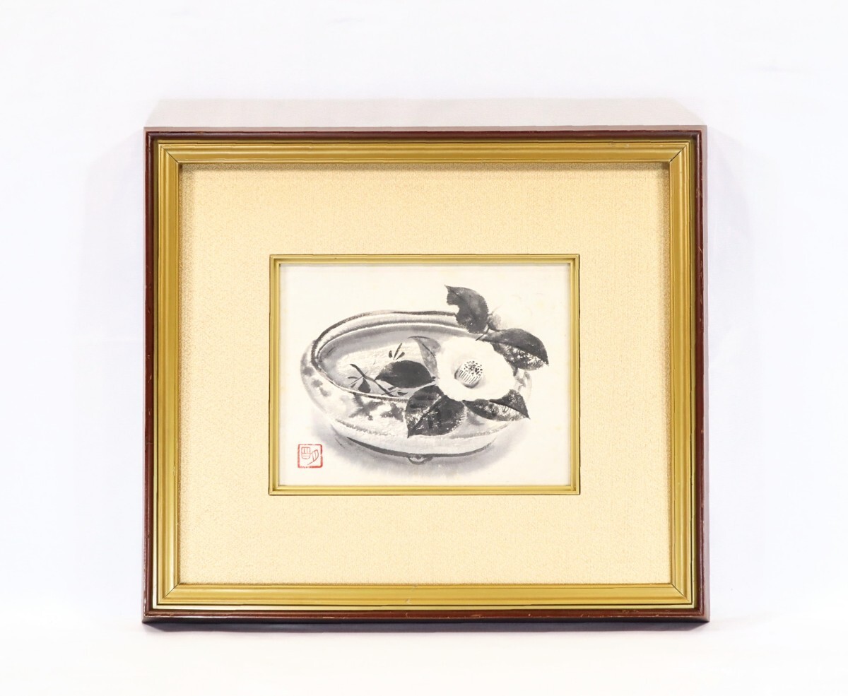 > 真作 穐月明 水墨「鉢の椿」画 24×19cm 2号 和歌山県出身 孤高の画家 潤いに満ちた水墨の濃淡 独特の世界観 滋味深く展開心象を映す 10551