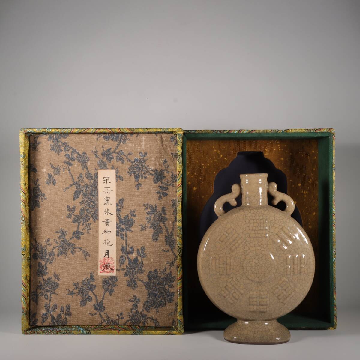 - 宋 哥窯 米黄釉 抱月瓶 扁壺 唐物 箱付き 陶磁器 中国美術 古美術 置物 高さ25.3cm 直径18cm CH33